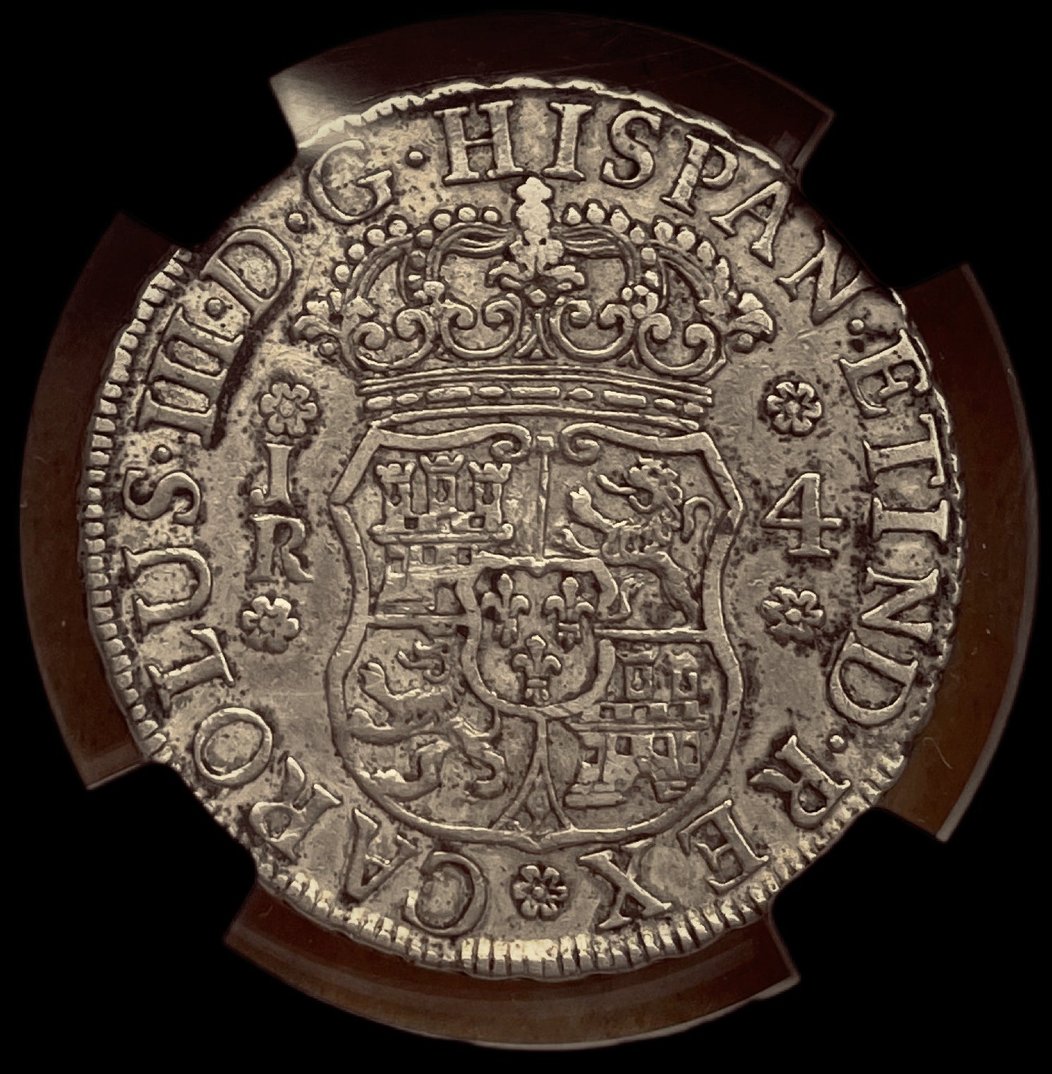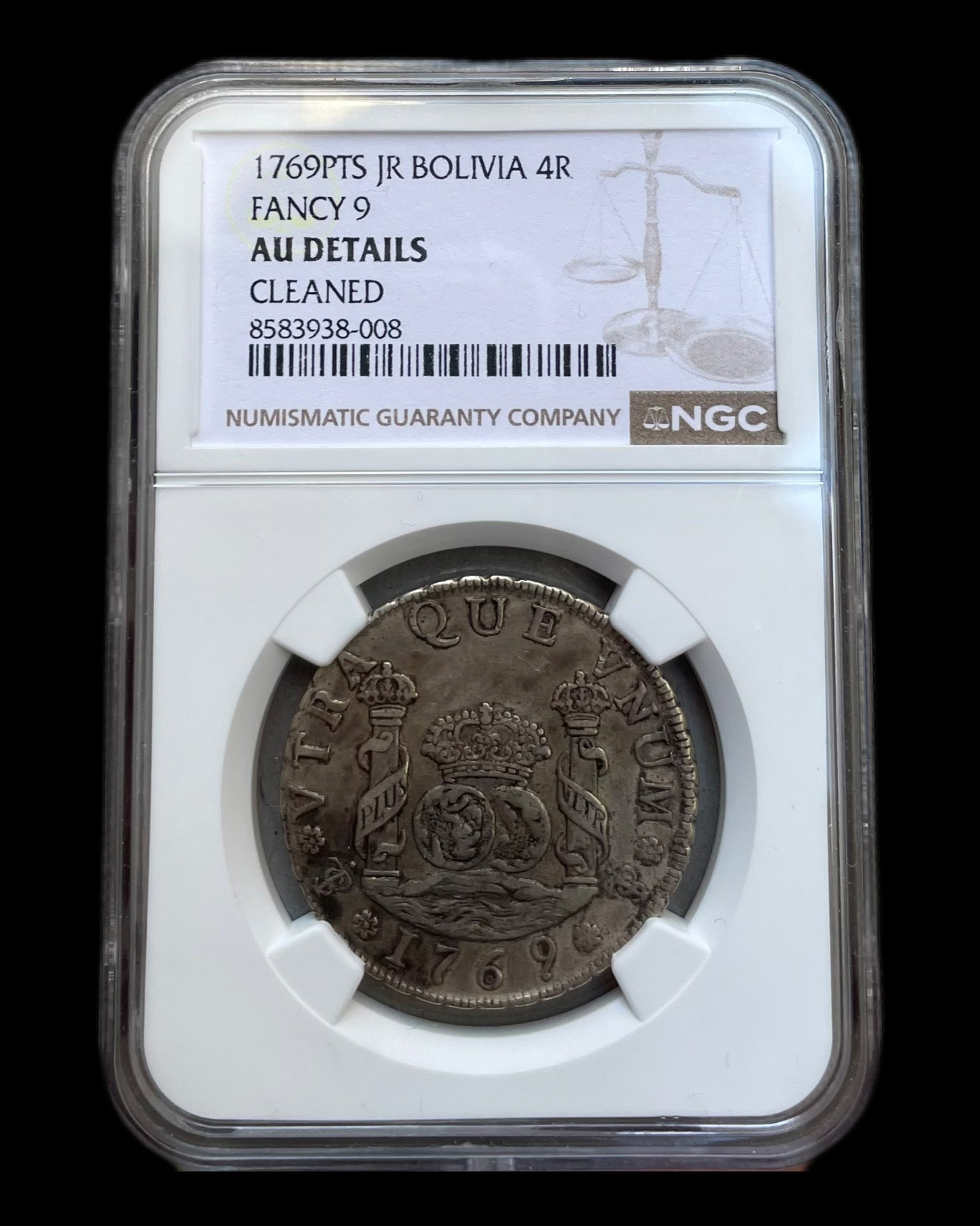 4 Reales columnarios Carlos III ceca Potosí año 1769 ensayador JR estado AU DETALLES Fancy 9, cleaned, encapsulada por NGC (8583938-008)