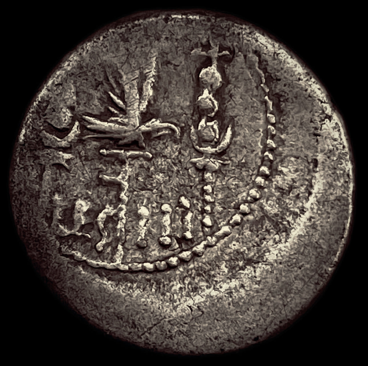Denario republica romana general Marco Antonio, fecha 43-30 a.C peso 3,9 g conservación MBC+, cuño parcialmente desplazado en reverso.